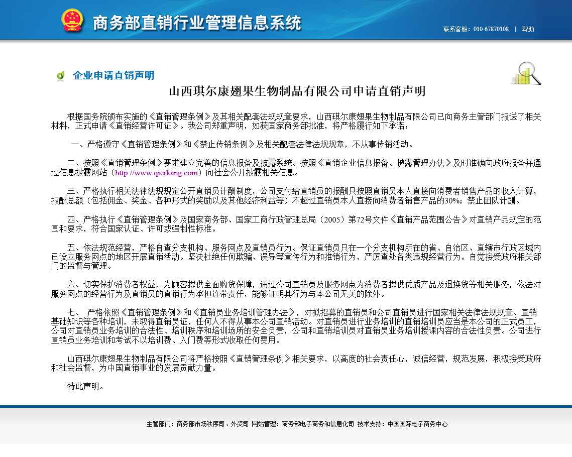 山西琪爾康翅果生物制品有限公司申請(qǐng)直銷聲明