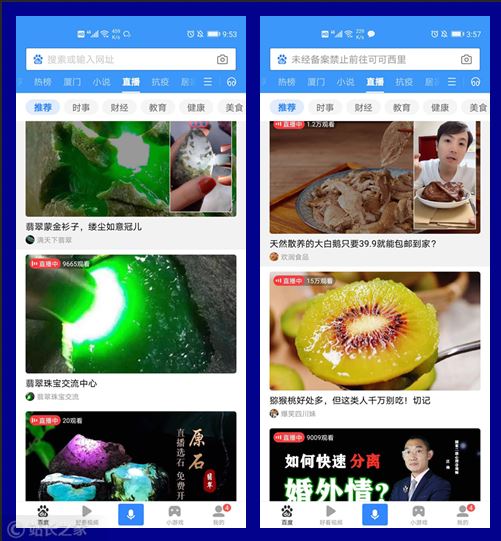 進入百度APP直播頻道之后,可以看到玉石翡翠視頻占了大多數(shù),另外占比較多的還有健康養(yǎng)生、情感類直播視頻。