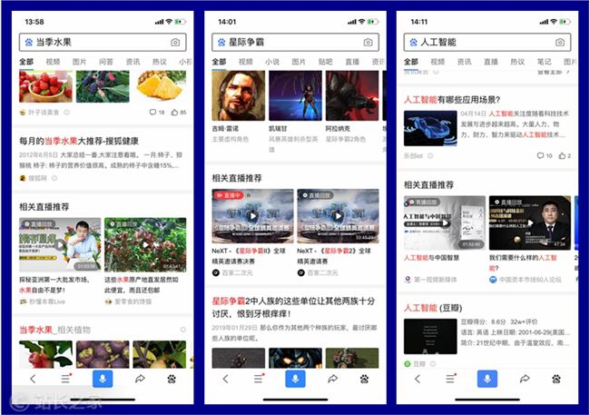 以搜索當季水果、星際爭霸、人工智能等幾個關鍵詞為例,均能看到搜索首頁展示了與這個關鍵詞有關的百度直播視頻。