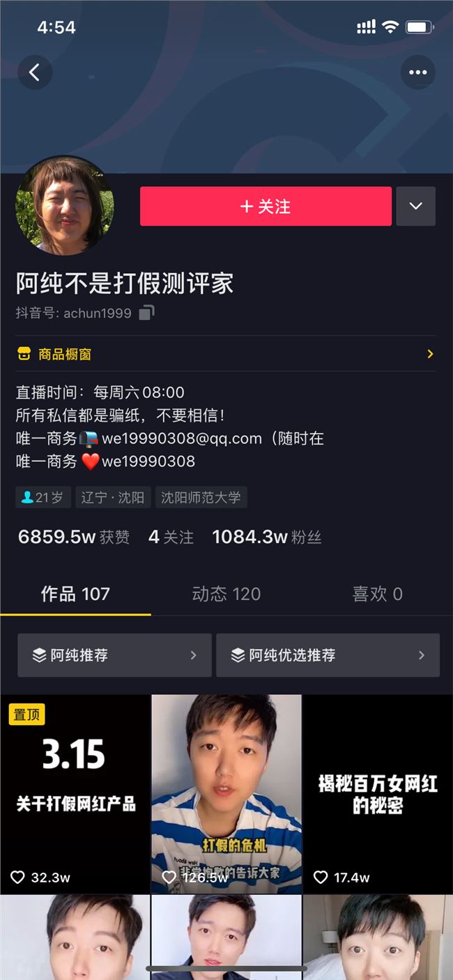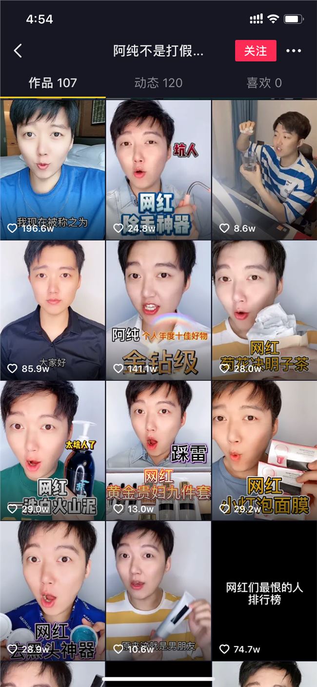 阿純其實(shí)很聰明,建立了兩個(gè)賬號(hào):一個(gè)賬號(hào)打假測(cè)評(píng),樹(shù)立人設(shè);一個(gè)賬號(hào)變裝獵奇,積累粉絲,為自己的另一個(gè)賬號(hào)引流。