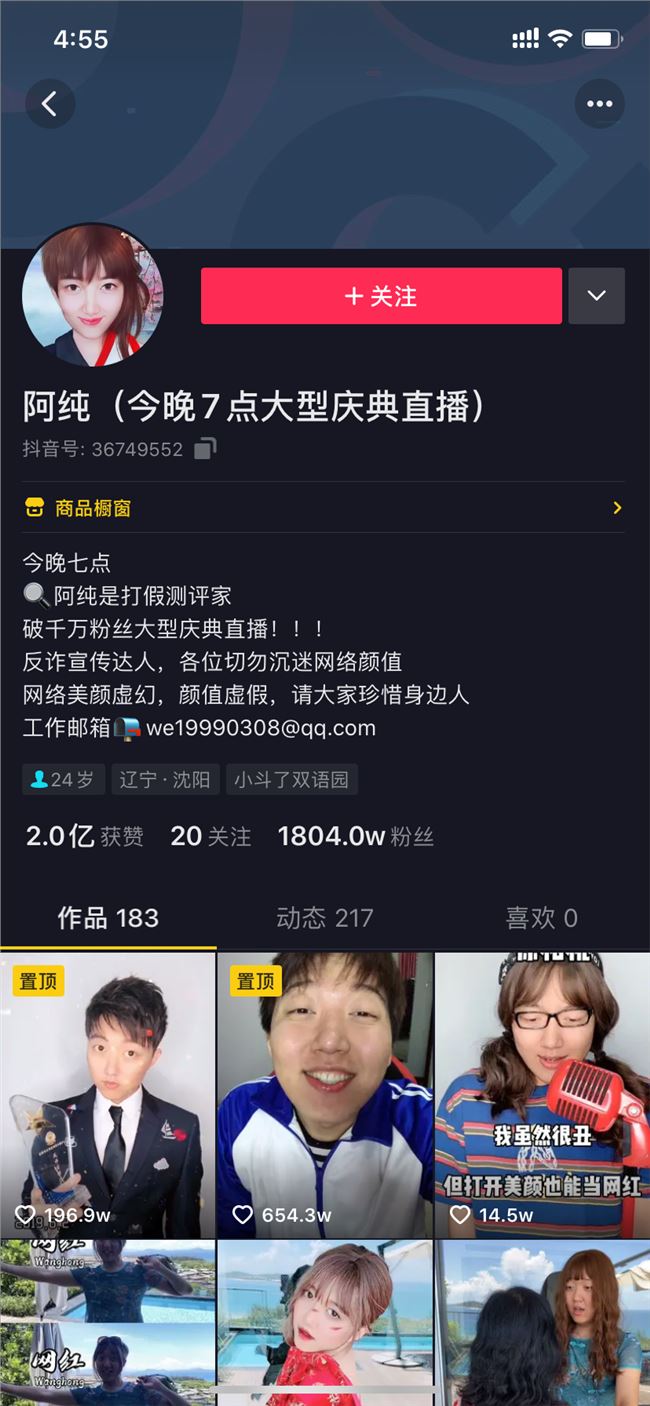 這個(gè)賬號(hào)主要更新的是阿純換裝的視頻,身高近 190 的阿純?cè)诜b和濾鏡等工具的作用下,秒變“小女生”,巨大的反差斬獲了大量粉絲,截至目前這個(gè)賬號(hào)的粉絲數(shù)達(dá)到了 1800 萬(wàn)+。