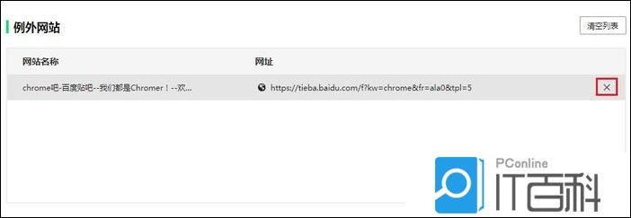 3、進入登錄管家設置頁面后,在頁面中找到“例外網站”這一欄,在其中找到永不保存的網頁,將鼠標移動上去之后點擊其右側的按鈕將其刪除就可以了。
