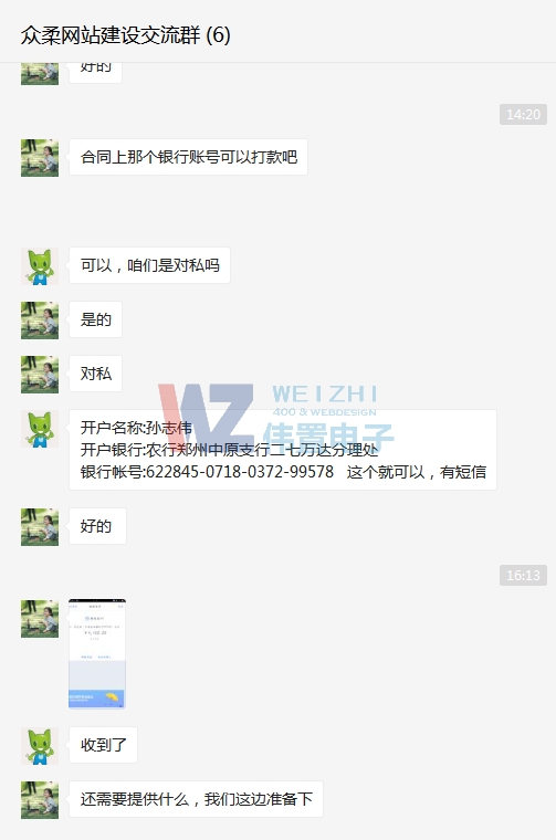昨日,5月27號我們公司網(wǎng)站推廣人員孫海山項目經(jīng)理與公司領(lǐng)導(dǎo)一起去眾柔商貿(mào)公司商談網(wǎng)站建設(shè)項目事宜,昨天正式簽訂網(wǎng)站建設(shè)合同,今日轉(zhuǎn)的款項。網(wǎng)站建設(shè)項目成立之后,備案專員與網(wǎng)站設(shè)計師積極引導(dǎo)客戶進行備案與網(wǎng)站設(shè)計事宜。域名為:www.zhongrou.net